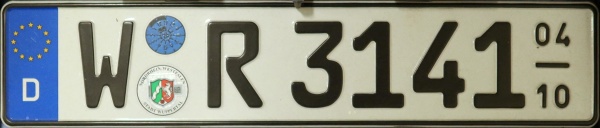 L G 9 Normal series since 1956. 1995 onwards plate style. L = Leipzig (since 1991). Z O 93 Normal series since 1956. 1995 onwards plate style. Z = Zwickau (since 1991). Z O 93 Close-up of the above. V U 99 Normal series since 1956. 1995 onwards plate style. V = Vogtlandkreis (since 1996). R/X 56 Normal series since 1956. 1995 onwards plate style. R = Regensburg. F W 721 Normal series since 1956. 1995 onwards plate style. F = Frankfurt am Main. F W 721 Close-up of the above. D C 288 Normal series since 1956. 1995 onwards plate style. D = Düsseldorf. D C 288 Close-up of the above. M V 892 Normal series since 1956. 1995 onwards plate style. M = München. M/O 734 Normal series since 1956. 1995 onwards plate style. M = München. M/O 734 Close-up of the above. A/B 540 Normal series since 1956. 1995 onwards plate style. A = Augsburg. H/I 741 Normal series since 1956. 1995 onwards plate style. Small size. H = Hannover. H/I 741 Close-up of the above. Z R 7308 Normal series since 1956. 1995 onwards plate style. Z = Zwickau (since 1991). Z R 7308 Close-up of the above. M W 6846 Normal series since 1956. 1995 onwards plate style. M = München. Z OX 6 Normal series since 1956. 1995 onwards plate style. Z = Zwickau (since 1991). Z OX 6 Close-up of the above. C EM 2 Normal series since 1956. 1995 onwards plate style. C = Chemnitz (since 1991). C PU 4 Normal series since 1956. 1995 onwards plate style. C = Chemnitz (since 1991). C PU 4 Close-up of the above. J/NJ 9 Normal series since 1956. 1995 onwards plate style. J = Jena (since 1991). G DD 12 Normal series since 1956. 1995 onwards plate style. G = Gera (since 1991). G DD 12 Close-up of the above. F CZ 18 Normal series since 1956. 1995 onwards plate style. F = Frankfurt am Main. M II 79 Normal series since 1956. 1995 onwards plate style. M = München. 'I' used as serial letter only since 2000. S/AF 46 Normal series since 1956. 1995 onwards plate style. S = Stuttgart. S/AF 46 Close-up of the above. B/JA 87 Normal series since 1956. 1995 onwards plate style. B = Berlin. K/AX 59 Normal series since 1956. 1995 onwards plate style. K = Köln. K/AX 59 Close-up of the above. D RK 170 Normal series since 1956. 1995 onwards plate style. D = Düsseldorf. D RK 170 Close-up of the above. A BS 780 Normal series since 1956. 1995 onwards plate style. A = Augsburg. A BS 780 Close-up of the above. J SD 700 Normal series since 1956. 1995 onwards plate style. J = Jena (since 1991). J SD 700 Close-up of the above. K MO 113 Normal series since 1956. 1995 onwards plate style. K = Köln. This plate has MO for Ford Mondeo. M XJ 161 Normal series since 1956. 1995 onwards plate style. M = München. B/TL 422 Normal series since 1956. 1995 onwards plate style. B = Berlin. B/TL 422 Close-up of the above. B/GB 208 Normal series since 1956. 1995 onwards plate style. B = Berlin. B/SJ 263 Normal series since 1956. 1995 onwards plate style. Small size. B = Berlin. B/SJ 263 Close-up of the above. R RR 5555 Normal series since 1956. 1995 onwards plate style. R = Regensburg. R RR 5555 Close-up of the above. B CD 1804 Normal series since 1956. 1995 onwards plate style. B = Berlin. B CD 1804 Close-up of the above. B MN 8843 Normal series since 1956. 1995 onwards plate style. B = Berlin. B MN 8843 Close-up of the above. B RT 5611 Normal series since 1956. 1995 onwards plate style. B = Berlin. Since 2010 there is only one seal on the front plate. B RT 5611 Close-up of the above. K DG 1559 Normal series since 1956. 1995 onwards plate style. K = Köln. S HQ 1591 Normal series since 1956. 1995 onwards plate style. S = Stuttgart. S HQ 1591 Close-up of the above. R/HU 2605 Normal series since 1956. 1995 onwards plate style. R = Regensburg. R/HU 2605 Close-up of the above. B/AN 3668 Normal series since 1956. 1995 onwards plate style. B = Berlin. B/SF 1993 Normal series since 1956. 1995 onwards plate style. B = Berlin. B/SF 1993 Close-up of the above. AÖ E 1 Normal series since 1956. 1995 onwards plate style. AÖ = Altötting. AÖ E 1 Close-up of the above. HL X 2 Normal series since 1956. 1995 onwards plate style. HL = Hansestadt Lübeck. HL X 2 Close-up of the above. OL L 6 Normal series since 1956. 1995 onwards plate style. OL = Oldenburg. RD E 2 Normal series since 1956. 1995 onwards plate style. RD = Rendsburg-Eckernförde. RV B 5 Normal series since 1956. 1995 onwards plate style. RV = Ravensburg. ZP Z 8 Normal series since 1956. 1995 onwards plate style. ZP = Zschopau (1991-94 and optionally since 2012). ZP Z 8 Close-up of the above. WO/M 4 Normal series since 1956. 1995 onwards plate style. WO = Worms. WO/M 4 Close-up of the above. PS/Z 6 Normal series since 1956. 1995 onwards plate style. PS = Pirmasens. GE F 86 Normal series since 1956. 1995 onwards plate style. GE = Gelsenkirchen. GE F 86 Close-up of the above. OL W 56 Normal series since 1956. 1995 onwards plate style. OL = Oldenburg. PR X 80 Normal series since 1956. 1995 onwards plate style. PR = Prignitz (since 1994). RU C 10 Normal series since 1956. 1995 onwards plate style. RU = Rudolfstadt (1991-95 and optionally since 2012). RU C 10 Close-up of the above. AC/M 43 Normal series since 1956. 1995 onwards plate style. AC = Aachen. AC/M 43 Close-up of the above. WL/V 14 Normal series since 1956. 1995 onwards plate style. WL = Harburg (Winsen (Luhe)). RZ/T 79 Normal series since 1956. 1995 onwards plate style. Small size. RZ = Herzogtum Lauenburg (Ratzeburg). RZ/T 79 Close-up of the above. RE B 286 Normal series since 1956. 1995 onwards plate style. RE = Recklinghausen. RE B 286 Close-up of the above. IK I 315 Normal series since 1956. 1995 onwards plate style. IK = Ilm-Kreis (since 1995). IK I 315 Close-up of the above. WÜ K 510 Normal series since 1956. 1995 onwards plate style. WÜ = Würzburg. MA/T 993 Normal series since 1956. 1995 onwards plate style. MA = Mannheim. MA/T 993 Close-up of the above. HH/W 650 Normal series since 1956. 1995 onwards plate style. HH = Hansestadt Hamburg. HH/W 650 Close-up of the above. KC/D 273 No