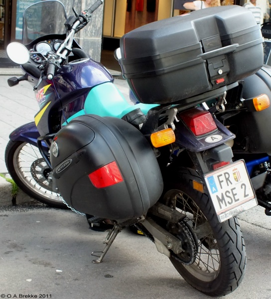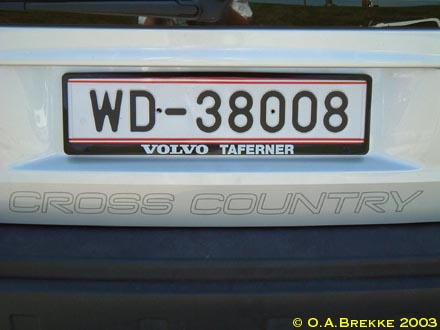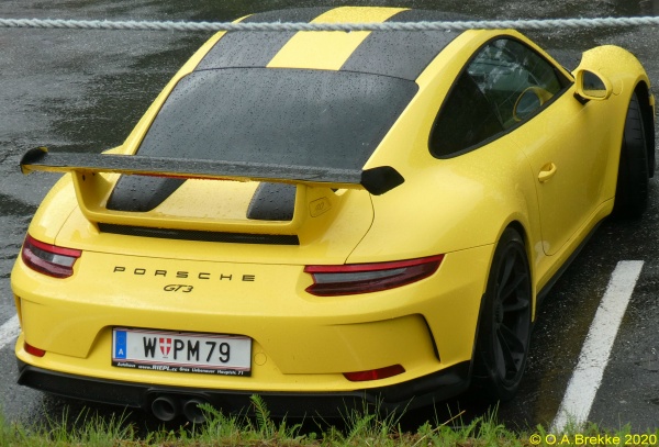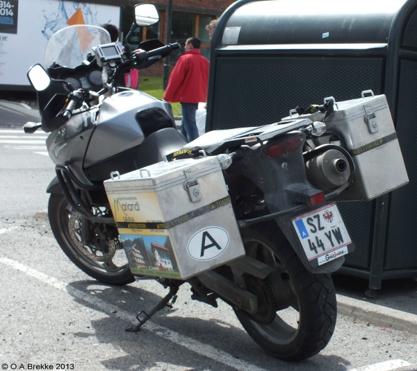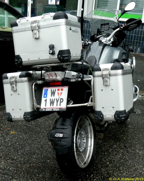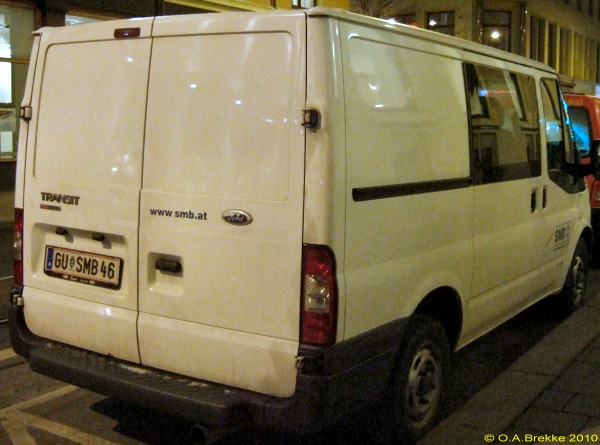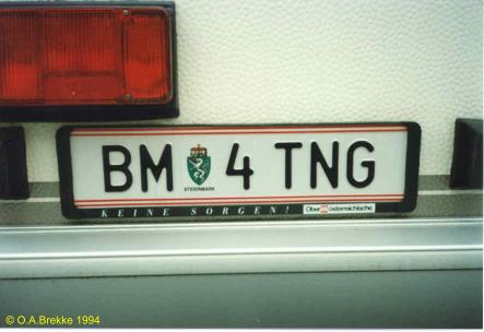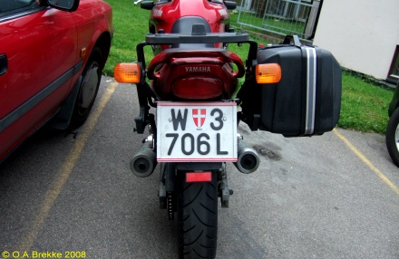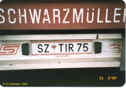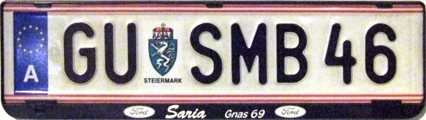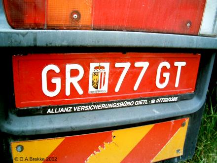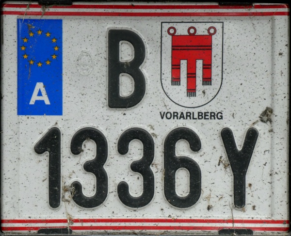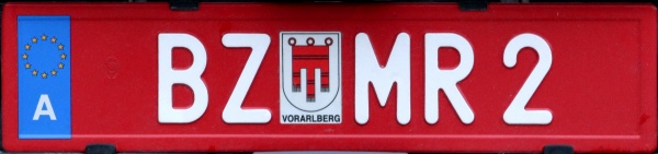 P 5113A Normal series since 1990. 2002 onwards plate style. P = St. Pölten Stadt. P 5113A Close-up of the above. L 2947P Normal series since 1990. 2002 onwards plate style. L = Linz Stadt in Oberösterreich. L 2947P Close-up of the above. W 8362B Normal series since 1990. 2002 onwards plate style. W = Wien. W 2240M Normal series since 1990. 2002 onwards plate style. W = Wien. W 2240M Close-up of the above. S 170MZ Normal series since 1990. 2002 onwards plate style. S = Salzburg Stadt in Salzburg. S 170MZ Close-up of the above. K 510BV Normal series since 1990. 2002 onwards plate style. K = Klagenfurt Stadt in Kärnten. L 154GV Normal series since 1990. 2002 onwards plate style. L = Linz Stadt in Oberösterreich. L 154GV Close-up of the above. S 535IL Normal series since 1990. 2002 onwards plate style. S = Salzburg Stadt in Salzburg. W/992GT Normal series since 1990. 2002 onwards plate style. W = Wien. GT (in Wien) = Commercial goods transport with trucks over 3.5t (Großtransport). W/992GT Close-up of the above. I/510AG Normal series since 1990. 2002 onwards plate style. I = Innsbruck Stadt in Tirol. G 33HWD Normal series since 1990. 2002 onwards plate style. G = Graz Stadt in Steiermark. G 33HWD Close-up of the above. G 53AAA Normal series since 1990. 2002 onwards plate style. G = Graz Stadt in Steiermark. G 53AAA Close-up of the above. G 55WRE Normal series since 1990. 2002 onwards plate style. G = Graz Stadt in Steiermark. W/81BGA Normal series since 1990. 2002 onwards plate style. W = Wien. W/81BGA Close-up of the above. W/44ALR Normal series since 1990. 2002 onwards plate style. W = Wien. W/59ASK Normal series since 1990. 2002 onwards plate style. W = Wien. W 56397I Normal series since 1990. 2002 onwards plate style. W = Wien. W 56397I Close-up of the above. W 17740N Normal series since 1990. 2002 onwards plate style. W = Wien. W 77779X Normal series since 1990. 2002 onwards plate style. W = Wien. W 77779X Close-up of the above. I 3268AT Normal series since 1990. 2002 onwards plate style. I = Innsbruck Stadt in Tirol. I 3268AT Close-up of the above. I 1618AD Normal series since 1990. 2002 onwards plate style. I = Innsbruck Stadt in Tirol. I 3348AD Normal series since 1990. 2002 onwards plate style. I = Innsbruck Stadt in Tirol. I 1180AS Normal series since 1990. 2002 onwards plate style. I = Innsbruck Stadt in Tirol. I 1180AS Close-up of the above. W 5329AB Normal series since 1990. 2002 onwards plate style. W = Wien. W 5329AB Close-up of the above. W 8362AI Normal series since 1990. 2002 onwards plate style. W = Wien. W 3352KP Normal series since 1990. 2002 onwards plate style. W = Wien. KP = Replacement rental for commercial goods vehicles under 3.5t (Kleintransport provisorisch). W 3352KP Close-up of the above. KO 276K Normal series since 1990. 2002 onwards plate style. KO = Korneuburg in Niederösterreich. KO 276K Close-up of the above. GR 217M Normal series since 1990. 2002 onwards plate style. GR = Grieskirchen in Oberösterreich. KI 167B Normal series since 1990. 2002 onwards plate style. KI = Kirchdorf an der Krems in Oberösterreich. HO/422D Normal series since 1990. 2002 onwards plate style. HO = Horn in Niederösterreich. HA 82EB Normal series since 1990. 2002 onwards plate style. HA = Hallein in Salzburg. HA 82EB Close-up of the above. RO 16SC Normal series since 1990. 2002 onwards plate style. RO = Rohrbach im Mühlkreis in Oberösterreich. BR/10AR Normal series since 1990. 2002 onwards plate style. BR = Braunau am Inn in Oberösterreich. BR/10AR Close-up of the above. BR 1MYN Normal series since 1990. 2002 onwards plate style. BR = Braunau am Inn in Oberösterreich. BR 1MYN Close-up of the above. BA 1KCA Normal series since 1990. 2002 onwards plate style. BA = Bad Aussee in Steiermark (-2012). IL 2YIB Normal series since 1990. 2002 onwards plate style. IL = Innsbruck-Land in Tirol. IL 2YIB Close-up of the above. LA 1WWK Normal series since 1990. 2002 onwards plate style. LA = Landeck in Tirol. LA 1WWK Close-up of the above. ZE 1699T Normal series since 1990. 2002 onwards plate style. ZE = Zell am See in Salzburg. T (in Salzburg) = Taxi. ZE 1699T Close-up of the above. DO 576CG Normal series since 1990. 2002 onwards plate style. DO = Dornbirn in Vorarlberg. DO 576CG Close-up of the above. BN 500AD Normal series since 1990. 2002 onwards plate style. BN = Baden in Niederösterreich. EF 418AR Normal series since 1990. 2002 onwards plate style. EF = Eferding in Oberösterreich. GM 415HE Normal series since 1990. 2002 onwards plate style. GM = Gmunden in Oberösterreich. GM 415HE Close-up of the above. IL 474CB Normal series since 1990. 2002 onwards plate style. IL = Innsbruck-Land in Tirol. With the bicycle rack repeater placed on the car and the normal rear plate on the bicycle rack. IL 753EJ Normal series since 1990. 2002 onwards plate style. IL = Innsbruck-Land in Tirol. JO 150FA Normal series since 1990. 2002 onwards plate style. JO = St Johann im Pongau in Salzburg. KI/361DH Normal series since 1990. 2002 onwards plate style. KI = Kirchdorf an der Krems in Oberösterreich. KI/361DH Close-up of the above. GF/938BC Normal series since 1990. 2002 onwards plate style. GF = Gänserndorf in Niederösterreich. LA/236BJ Normal series since 1990. 2002 onwards plate style. LA = Landeck in Tirol. With the unofficial addition of a black sticker across the European stars. LA/236BJ Close-up of the above. B RD 1 Personalised series since 1990. 2002 onwards plate style. B = Bregenz in Vorarlberg. B RD 1 Close-up of the above. B V 949 Personalised series since 1990. 2002 onwards plate style. B = Bregenz in Vorarlberg. This is most likely the owner's registration from the old Vorarlberg series (V 949). B V 949 Close-up of the above. B V 949 The above seen on a new vehicle in 2017. B V 949 Close-up of the above. L Z 777 Personalised series since 1990. 2002 onwards plate style. L = Linz Stadt in Oberösterreich. W JA 55 Personalised series since 1990. 2002 onwards plate style. W = Wien. 