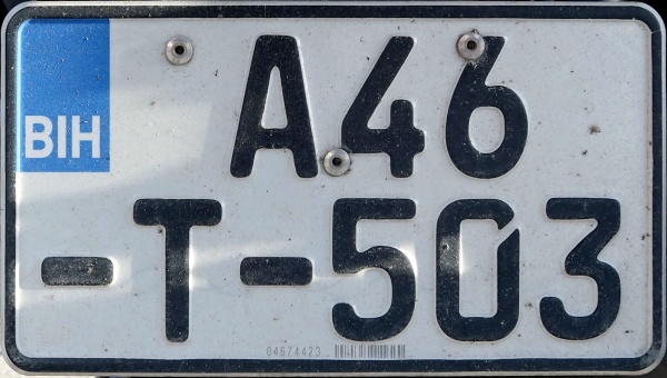 E32-A-501 Normal series since 2009. No coding. E32-A-501 Close-up of the above. A34-E-643 Normal series since 2009. No coding. A34-E-643 Close-up of the above. K13-M-972 Normal series since 2009. No coding. K13-M-972 Close-up of the above. K38-O-492 Normal series since 2009. No coding. K38-O-492 Close-up of the above. A46/-T-503 Normal series since 2009. Motorcycle. No coding. A46/-T-503 Close-up of the above. 006-K-098 Normal series 1998-2009. No coding. 006-K-098 Close-up of the above. 955-J-442 Normal series 1998-2009. No coding. 519-K-238 Normal series 1998-2009. No coding. 014-T-858 Normal series 1998-2009. No coding. 014-T-858 Close-up of the above. 014-T-858 Rear plate of the above showing the use of a (BiH) oval. 876-J-060 Normal series 1998-2009. American size, probably unofficial. No coding. 215-M/-893 Normal series 1998-2009. No coding. OBSOLETE LICENSE PLATES - NO LONGER VALID SA 982-48 Yugoslav normal series 1961-92. SA = Sarajevo. TR 317-FA Herceg-Bosna normal series 1992/3-98. TR = Travnik. SA 39-A-009 Diplomatic series 1994-2009. 1994-98 plate style. SA = Sarajevo. 39 = Norway. A = Diplomatic Corps. SA 37-A-203 Diplomatic series 1994-2009. 1998-2009 onwards plate style. SA = Sarajevo. 37 = Office of the High Representative. A = Diplomatic Corps. 726-K-535 Export series 1998-2009. No coding. |
