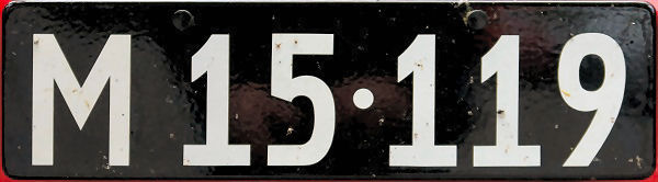 Historical number plate, since 1997. 1950-58 style. M = Odense Amt. 15·000-16·999 = Assens.