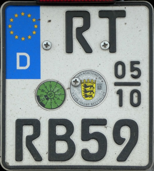 Normal series since 1956. 2011 onwards optional motorcycle plate style. RT = Reutlingen.