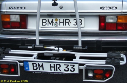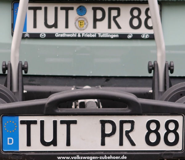 L G 9 Normal series since 1956. 1995 onwards plate style. L = Leipzig (since 1991). Z O 93 Normal series since 1956. 1995 onwards plate style. Z = Zwickau (since 1991). Z O 93 Close-up of the above. V U 99 Normal series since 1956. 1995 onwards plate style. V = Vogtlandkreis (since 1996). R/X 56 Normal series since 1956. 1995 onwards plate style. R = Regensburg. F W 721 Normal series since 1956. 1995 onwards plate style. F = Frankfurt am Main. F W 721 Close-up of the above. D C 288 Normal series since 1956. 1995 onwards plate style. D = Düsseldorf. D C 288 Close-up of the above. M V 892 Normal series since 1956. 1995 onwards plate style. M = München. M/O 734 Normal series since 1956. 1995 onwards plate style. M = München. M/O 734 Close-up of the above. A/B 540 Normal series since 1956. 1995 onwards plate style. A = Augsburg. H/I 741 Normal series since 1956. 1995 onwards plate style. Small size. H = Hannover. H/I 741 Close-up of the above. Z R 7308 Normal series since 1956. 1995 onwards plate style. Z = Zwickau (since 1991). Z R 7308 Close-up of the above. M W 6846 Normal series since 1956. 1995 onwards plate style. M = München. Z OX 6 Normal series since 1956. 1995 onwards plate style. Z = Zwickau (since 1991). Z OX 6 Close-up of the above. C EM 2 Normal series since 1956. 1995 onwards plate style. C = Chemnitz (since 1991). C PU 4 Normal series since 1956. 1995 onwards plate style. C = Chemnitz (since 1991). C PU 4 Close-up of the above. J/NJ 9 Normal series since 1956. 1995 onwards plate style. J = Jena (since 1991). G DD 12 Normal series since 1956. 1995 onwards plate style. G = Gera (since 1991). G DD 12 Close-up of the above. F CZ 18 Normal series since 1956. 1995 onwards plate style. F = Frankfurt am Main. M II 79 Normal series since 1956. 1995 onwards plate style. M = München. 'I' used as serial letter only since 2000. S/AF 46 Normal series since 1956. 1995 onwards plate style. S = Stuttgart. S/AF 46 Close-up of the above. B/JA 87 Normal series since 1956. 1995 onwards plate style. B = Berlin. K/AX 59 Normal series since 1956. 1995 onwards plate style. K = Köln. K/AX 59 Close-up of the above. D RK 170 Normal series since 1956. 1995 onwards plate style. D = Düsseldorf. D RK 170 Close-up of the above. A BS 780 Normal series since 1956. 1995 onwards plate style. A = Augsburg. A BS 780 Close-up of the above. J SD 700 Normal series since 1956. 1995 onwards plate style. J = Jena (since 1991). J SD 700 Close-up of the above. K MO 113 Normal series since 1956. 1995 onwards plate style. K = Köln. This plate has MO for Ford Mondeo. M XJ 161 Normal series since 1956. 1995 onwards plate style. M = München. B/TL 422 Normal series since 1956. 1995 onwards plate style. B = Berlin. B/TL 422 Close-up of the above. B/GB 208 Normal series since 1956. 1995 onwards plate style. B = Berlin. B/SJ 263 Normal series since 1956. 1995 onwards plate style. Small size. B = Berlin. B/SJ 263 Close-up of the above. R RR 5555 Normal series since 1956. 1995 onwards plate style. R = Regensburg. R RR 5555 Close-up of the above. B CD 1804 Normal series since 1956. 1995 onwards plate style. B = Berlin. B CD 1804 Close-up of the above. B MN 8843 Normal series since 1956. 1995 onwards plate style. B = Berlin. B MN 8843 Close-up of the above. B RT 5611 Normal series since 1956. 1995 onwards plate style. B = Berlin. Since 2010 there is only one seal on the front plate. B RT 5611 Close-up of the above. K DG 1559 Normal series since 1956. 1995 onwards plate style. K = Köln. S HQ 1591 Normal series since 1956. 1995 onwards plate style. S = Stuttgart. S HQ 1591 Close-up of the above. R/HU 2605 Normal series since 1956. 1995 onwards plate style. R = Regensburg. R/HU 2605 Close-up of the above. B/AN 3668 Normal series since 1956. 1995 onwards plate style. B = Berlin. B/SF 1993 Normal series since 1956. 1995 onwards plate style. B = Berlin. B/SF 1993 Close-up of the above. AÖ E 1 Normal series since 1956. 1995 onwards plate style. AÖ = Altötting. AÖ E 1 Close-up of the above. HL X 2 Normal series since 1956. 1995 onwards plate style. HL = Hansestadt Lübeck. HL X 2 Close-up of the above. OL L 6 Normal series since 1956. 1995 onwards plate style. OL = Oldenburg. RD E 2 Normal series since 1956. 1995 onwards plate style. RD = Rendsburg-Eckernförde. RV B 5 Normal series since 1956. 1995 onwards plate style. RV = Ravensburg. ZP Z 8 Normal series since 1956. 1995 onwards plate style. ZP = Zschopau (1991-94 and optionally since 2012). ZP Z 8 Close-up of the above. WO/M 4 Normal series since 1956. 1995 onwards plate style. WO = Worms. WO/M 4 Close-up of the above. PS/Z 6 Normal series since 1956. 1995 onwards plate style. PS = Pirmasens. GE F 86 Normal series since 1956. 1995 onwards plate style. GE = Gelsenkirchen. GE F 86 Close-up of the above. OL W 56 Normal series since 1956. 1995 onwards plate style. OL = Oldenburg. PR X 80 Normal series since 1956. 1995 onwards plate style. PR = Prignitz (since 1994). RU C 10 Normal series since 1956. 1995 onwards plate style. RU = Rudolfstadt (1991-95 and optionally since 2012). RU C 10 Close-up of the above. AC/M 43 Normal series since 1956. 1995 onwards plate style. AC = Aachen. AC/M 43 Close-up of the above. WL/V 14 Normal series since 1956. 1995 onwards plate style. WL = Harburg (Winsen (Luhe)). RZ/T 79 Normal series since 1956. 1995 onwards plate style. Small size. RZ = Herzogtum Lauenburg (Ratzeburg). RZ/T 79 Close-up of the above. RE B 286 Normal series since 1956. 1995 onwards plate style. RE = Recklinghausen. RE B 286 Close-up of the above. IK I 315 Normal series since 1956. 1995 onwards plate style. IK = Ilm-Kreis (since 1995). IK I 315 Close-up of the above. WÜ K 510 Normal series since 1956. 1995 onwards plate style. WÜ = Würzburg. MA/T 993 Normal series since 1956. 1995 onwards plate style. MA = Mannheim. MA/T 993 Close-up of the above. HH/W 650 Normal series since 1956. 1995 onwards plate style. HH = Hansestadt Hamburg. HH/W 650 Close-up of the above. KC/D 273 No