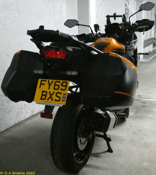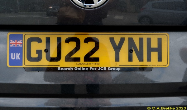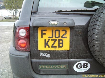 FR12 UBB Normal series since 2001. Front plate. F = Forest and Fens. FR = Lincoln. 12 = 1.3.2012-31.8.2012. FR12 UBB Close-up of the above. YC51 TFA Normal series since 2001. Front plate. Y = Yorkshire. YC = Leeds. 51 = 1.9.2001- 28.2.2002. LF55/WPP Normal series since 2001. Front plate. L = London. LF = Wimbledon. 55 = 1.9.2005-28.2.2006. This is actually an age related mark issued to an import vehicle. LF55/WPP Close-up of the above. SR02/LKV Normal series since 2001. Front plate. S = Scotland. SR = Dundee. 02 = 1.3.2002- 31.8.2002. NC62/NFY Normal series since 2001. Front plate. American size. The first N = North East. NC = Newcastle-upon-Tyne. 62 = 1.9.2012-28.2.2013. NC62/NFY Close-up of the above. SV60 NNB Normal series since 2001. Rear plate. S = Scotland. SV = Aberdeen. 60 = 1.9.2010- 28.2.2011. SV60 NNB Close-up of the above. AM58 NKD Normal series since 2001. Rear plate. A = Anglia. AM = Peterborough. 58 = 1.9.2008- 28.2.2009. AM58 NKD Close-up of the above. AR04 HKC Normal series since 2001. Rear plate. A = Anglia. AR = Norwich. 04 = 1.3.2004- 31.8.2004. AR04 HKC Close-up of the above. EO55 FRF Normal series since 2001. Rear plate. E = Essex. EO = Chelmsford. 55 = 1.9.2005- 28.2.2006. EO55 FRF Close-up of the above. RJ53 HRC Normal series since 2001. Rear plate. The first R = Reading. RJ = Reading (-2007). 53 = 1.9.2003-29.2.2004. Trailers display the registration of the towing vehicle. SM51 LFN Normal series since 2001. Rear plate. S = Scotland. SM = Edinburgh. 51 = 1.9.2001- 28.2.2002. SV12 NRZ Normal series since 2001. Rear plate. S = Scotland. SV = Aberdeen. 12 = 1.3.2012-31.8.2012. With a (SCO) oval. FY07 VYX Normal series since 2001. Rear plate, should have been yellow. F = Forest and Fens. FY = Lincoln. 07 = 1.3.2007-31.8.2007. NL61 EEU Normal series since 2001. Rear plate, should have been yellow. N = North East. NL = Newcastle-upon-Tyne. 61 = 1.9.2011-29.2.2012. NL61 EEU Close-up of the above. SK67 DLF Normal series since 2001. Rear plate, should have been yellow. S = Scotland. SK = Edinburgh. 67 = 1.9.2017-28.2.2018. This plate is illegally spaced. SK67 DLF Close-up of the above. YC06 WWX Normal series since 2001. Rear plate, should have been yellow. Y = Yorkshire. YC = Leeds. 06 = 1.3.2006-31.8.2006. YC06 WWX Close-up of the above. FP56 XDN Normal series since 2001. Rear plate, should have been yellow. F = Forest and Fens. FP = Nottingham. 56 = 1.9.2006-28.2.2007. FP56 XDN Same as the above. Changed to yellow rear plate by 2018. FH06/OGZ Normal series since 2001. Rear plate. F = Forest and Fens. FH = Nottingham. 06 = 1.3.2006-31.8.2006. FH06/OGZ Close-up of the above. YD13/HXN Normal series since 2001. Rear plate. Y = Yorkshire. YD = Leeds. 13 = 1.3.2013- 31.8.2013. YD13/HXN Close-up of the above. BD12/PYZ Normal series since 2001. Rear plate. B = Birmingham. BD = Birmingham. 12 = 1.3.2012-31.8.2012. This is a trailer displaying the same registration as the towing vehicle. BD12/PYZ Close-up of the above. FJ02/KZB Normal series since 2001. Rear plate. F = Forest and Fens. FJ = Nottingham. 02 = 1.3.2002-31.8.2002. LJ51/LZA Normal series since 2001. Rear plate. The first L = London. LJ = Wimbledon. 51 = 1.9.2001-28.2.2002. HY58/BUH Normal series since 2001. Rear plate. American size. H = Hampshire. HY = Portsmouth. 58 = 1.9.2008-28.2.2009. HY58/BUH Close-up of the above. LG06/XBM Normal series since 2001. Rear plate. American size. L = London. LG = Wimbledon. 06 = 1.3.2006-31.8.2006. LG06/XBM Close-up of the above. SX16/COU Normal series since 2001. Motorcycle. S = Scotland. SX = Inverness. 16 = 1.3.2016- 31.8.2016. SX16/COU Close-up of the above. HJ02/TWC Normal series since 2001. Motorcycle. H = Hampshire. HJ = Bournemouth. 02 = 1.3.2002-31.8.2002. PJ03 NNP Normal series since 2001. Motorcycle. P = Preston. PJ = Preston. 03 = 1.3.2003- 31.8.2003. Illegally small plate. LC53/MXH Normal series since 2001. Motorcycle. L = London. LC = Wimbledon. 53 = 1.9.2003- 29.2.2004. Plate made up in wrong colours. BV16 UCJ Normal series since 2001. Front plate. B = Birmingham. BV = Birmingham. 16 = 1.3.2016- 31.8.2016. With the addition of a UK sticker following the change of international distinguishing sign in 2021. BV16 UCJ Close-up of the above. WP61 VSJ Normal series since 2001. Front plate. W = West of England. WP = Bristol. 61 = 1.9.2011-29.2.2012. With the addition of a UK sticker following the change of international distinguishing sign in 2021. WP61 VSJ Close-up of the above. RV61 CXM Normal series since 2001. Rear plate. R = Reading. RV = Theale (since 2007). 61 = 1.9.2011-29.2.2012. With the addition of a UK sticker following the change of international distinguishing sign in 2021. RV61 CXM Close-up of the above. FY69/BXS Normal series since 2001. Motorcycle. F = Forest and Fens. FY = Lincoln. 69 = 1.9.2019- 29.2.2020. With the addition of a UK sticker following the change of international distinguishing sign in 2021. FY69/BXS Close-up of the above. NL23 XCV Normal series since 2001. Front plate. N = North East. NL = Newcastle-upon-Tyne. 23 = 1.3.2023-31.8.2023. With UK and the Union Jack in the blue band. NL23 XCV Close-up of the above. GU22 YNH Normal series since 2001. Rear plate. G = Garden of England. GU = Brighton. 22 = 1.3.2022-31.8.2022. With UK and the Union Jack in the blue band. YX64 EXP Normal series since 2001. Rear plate. Y = Yorkshire. YX = Beverley. 64 = 1.9.2014- 28.2.2015. With UK and the Union Jack in the blue band. WA22 LVJ Normal series since 2001. Rear plate. W = West of England. WA = Exeter. 22 = 1.3.2022-31.8.2022. With UK and the Union Jack. WA22 LVJ Close-up of the above. EG19/CCD Normal series since 2001. Motorcycle. E = Essex. EG = Chelmsford. 19 = 1.3.2019-31.8.2019. With UK and the Union Jack. EG19/CCD Close-up of the above. LM14 NHB Normal series since 2001. Rear plate. L = London. LM = Borehamwood (since 2006). 14 = 1.3.2014-31.8.2014. This plate has the flag of England. LM14 NHB Close-up of the above. KP11 XXB Normal series since 2001. F