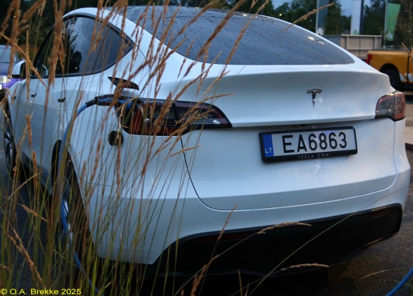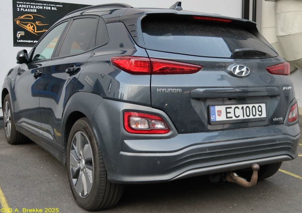 MUT 375 Normal series since 1992. 2023 onwards plate style. No coding. MUT 375 Close-up of the above. Vytis Close-up of the coat of arms. LAS 701 Normal series since 1992. 2023 onwards plate style. No coding. This is an older registration remade on 2023 plates. LAS 701 Close-up of the above. CCK 333 Normal series since 1992, probably personalised within the normal series. 2023 onwards plate style. No coding since 2003. CCK 333 Close-up of the above. UV 557 Trailer series since 1992. 2023 onwards plate style. No coding. UV 557 Close-up of the above. TZ 398 Trailer series since 1992. 2023 onwards plate style. No coding. TZ 398 Close-up of the above. KI 184 Trailer series since 1992. 2023 onwards plate style. No coding. After ZZ was reached c.2024 combinations with "I" have been issued. 361 JL Motorcycle series since 1992. 2023 onwards plate style. No coding. 361 JL Close-up of the above. 687/JM Motorcycle series since 1992. 2023 onwards optional plate style. No coding. 687/JM Close-up of the above. 1835 BC Temporary series since 2018. 2006 onwards plate style. No coding. 1835 BC Close-up of the above. 1826 BC Temporary series since 2018. 2006 onwards plate style. No coding. 1832 BC Temporary series since 2018. 2006 onwards plate style. No coding. 1832 BC Close-up of the above. 1833 BC Temporary series since 2018. 2006 onwards plate style. No coding. 1833 BC Close-up of the above. 1834 BC Temporary series since 2018. 2006 onwards plate style. No coding. 1834 BC Close-up of the above. 0618B Temporary motorcycle series since 2006. 2006 onwards plate style. No coding. 0618B Close-up of the above. EB5574 Electric vehicle series since 2016. 2023 onwards plate style. E = Electric vehicles. EB5574 Close-up of the above. EC1009 Electric vehicle series since 2016. 2023 onwards plate style. E = Electric vehicles. EC1009 Close-up of the above. JLK 912 Normal series since 1992. 1992 - April 2004 plate style. District coded until 2003. L = Klaipėda. JLK 912 Close-up of the above. BVT 107 Normal series since 1992. 1992 - April 2004 plate style. District coded until 2003. V = Vilnius. VKR 083 Normal series since 1992. 1992 - April 2004 plate style. District coded until 2003. K = Kaunas. VKR was issued out of sequence and does not have a square rear plate. VKR 083 Close-up of the above. ZMZ 767 Normal series since 1992. 1992 - April 2004 plate style. District coded until 2003. M = Marijampolė. ZMZ was issued out of sequence and does not have a square rear plate. ZMZ 767 Close-up of the above. ABK 731 Normal series since 1992. 1992 - April 2004 plate style. No coding since 2003. ABM 783 Normal series since 1992. 1992 - April 2004 plate style. No coding since 2003. TTT 286 Normal series since 1992. 1992 - April 2004 plate style. No coding since 2003. The TTT series was issued out of sequence. VGS 658 Normal series since 1992. 1992 - April 2004 plate style. No coding since 2003. The VGS series was issued out of sequence. ADD678 Normal series since 1992. May - September 2004 plate style. No coding since 2003. ADD678 Close-up of the above. ADB701 Normal series since 1992. May - September 2004 plate style. No coding since 2003. AEG374 Normal series since 1992. May - September 2004 plate style. No coding since 2003. AEG374 Close-up of the above. JAN 501 Normal series since 1992. 2004-18 plate style. No coding since 2003. JAN 501 Close-up of the above. AFM 095 Normal series since 1992. 2004-18 plate style. No coding since 2003. AFM 095 Close-up of the above. AHO 890 Normal series since 1992. 2004-18 plate style. No coding since 2003. HHH 946 Normal series since 1992. 2004-18 plate style. No coding since 2003. HHH 946 Close-up of the above. KLN 990 Normal series since 1992. 2004-18 plate style. District coded until 2003. L = Klaipėda. This is an older registration remade on europlates. MMO 792 Normal series since 1992. 2004-18 plate style. District coded until 2003. M = Marijampolė. MMO was issued out of sequence. This is an older registration remade on europlates. MMO 792 Close-up of the above. LNS 979 Normal series since 1992. 2018-23 plate style. No coding since 2003. LNS 979 Close-up of the above. KOL 811 Normal series since 1992. 2018-23 plate style. No coding since 2003. KOL 811 Close-up of the above. MIB 135 Normal series since 1992. 2018-23 plate style. No coding since 2003. MIB 135 Close-up of the above. MII 331 Normal series since 1992. 2018-23 plate style. No coding since 2003. MII 331 Close-up of the above. EHL 607 Normal series since 1992. 2018-23 plate style. No coding since 2003. This is an older registration remade in 2018-23 style. EHL 607 Close-up of the above. ZKE/677 Normal series since 1992. 1992 - September 2004 plate style. District coded until 2003. K = Kaunas. Two line plates started with Z or V. ZAT 953 Normal series since 1992. 2004-18 plate style. American size. District coded until 2003. A = Alytus. Two line plates started with Z or V. In an interim period plates with region code letters in the middle were issued. BEF 681 Normal series since 1992. 2004-18 plate style. American size. No coding since 2003. BEF 681 Close-up of the above. CBV 454 Normal series since 1992. 2004-18 plate style. American size. No coding since 2003. MYZ 378 Normal series since 1992. 2018-23 plate style. American size. No coding since 2003. MYZ 378 Close-up of the above. LAZ 370 Normal series since 1992. 2018-23 plate style. American size. No coding since 2003. ABH 777 Normal series since 1992, probably personalised within the normal series. 1992 - April 2004 plate style, but on a much newer car. No coding since 2003. ABH 777 Close-up of the above. ADT005 Normal series since 1992, probably personalised within the normal series. May - September 2004 plate style. No coding since 2003. ADT005 Close-up of the above. ZPK/777 Normal series since 1992, probably personalised within the normal series. 1992 - September 2004 plate style. District coded until 2003. P = Panėvežys. Two line plates started with Z or V. U