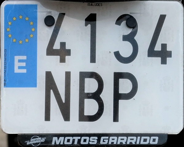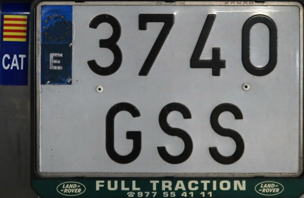 6946 MBG Normal series since 2000. No coding. 6946 MBG Close-up of the above. 3906 BKX Normal series since 2000. No coding. 0889 CLG Normal series since 2000. No coding. 0889 CLG Close-up of the above. 1657 DTP Normal series since 2000. No coding. 1657 DTP Close-up of the above. 7995 FJH Normal series since 2000. No coding. 2463 HRR Normal series since 2000. No coding. With the blue band covered by a piece of tape. 2463 HRR Close-up of the above. 2744 KNT Normal series since 2000. No coding. Trailers under 750 kg display the registration of the towing vehicle. 5124/HFS Normal series since 2000. No coding. 5124/HFS Close-up of the above. 5974/BDX Normal series since 2000. No coding. 3740/GSS Normal series since 2000. No coding. With an added CAT sticker for Catalonia, apparently previously attached over the euroband with the E. 3740/GSS Close-up of the above. 1215 HCP Normal series since 2000. Small plate. No coding. 1215 HCP Close-up of the above. 7995 FJH Normal series since 2000. Small plate. No coding. 4134/NBP Normal series since 2000. Motorcycle. No coding. 4134/NBP Close-up of the above. 6811/BLF Normal series since 2000. Motorcycle. No coding. 3612/FFB Normal series since 2000. Motorcycle. No coding. 3612/FFB Close-up of the above. 3806/KTZ Normal series since 2000. Motorcycle. No coding. 3806/KTZ Close-up of the above. 1579 BHS SP Public service vehicle. Supplementary SP plates have been used at least since 1935. Registration from the normal series. SP = Servicio Publico (Public Service). H 1112 BBB Historical vehicle series since 1999. H = Historical. P 0648 BDJ Provisional series since 1999. P = Provisional. Small size lettering. P 0648 BDJ Close-up of the above. P 7291 BBD Provisional series since 1999. P = Provisional. Small size lettering. P 2370 BDK Provisional series since 1999. P = Provisional. P 2370 BDK Close-up of the above. P-9256-BBD Provisional series since 1999. P = Provisional. With hyphens. R 9933 BCK Trailer series over 750 kg since 1999. R = Remolque (trailer). Trailers also display the registration of the towing vehicle, in this case 3591 FPW. R 9933 BCK Close-up of the above. R 5456 BBD Trailer series over 750 kg since 1999. R = Remolque (trailer). R 7199 BCG Trailer series over 750 kg since 1999. R = Remolque (trailer). R 7199 BCG Trailer series over 750 kg since 1999. R = Remolque (trailer). Trailers also display the registration of the towing vehicle, in this case the Romanian CJ 13 SSO. Normal series since 1992. 2007 onwards plate style. CJ = Cluj. R 7199 BCG Close-up of the above. R 0316 BCJ Trailer series over 750 kg since 1999. R = Remolque (trailer). R 0316 BCJ Trailer series over 750 kg since 1999. R = Remolque (trailer). Trailers also display the registration of the towing vehicle, in this case 8802 GPX. R 0316 BCJ Close-up of the above. R 8872 BCV Trailer series over 750 kg since 1999. Flat plastic plate. R = Remolque (trailer). Trailers also display the registration of the towing vehicle, in this case 5069 JKS. R 8872 BCV Close-up of the above. R0 288 BCW Trailer series over 750 kg since 1999. R = Remolque (trailer). This plate is erroneously spaced. R0 288 BCW Close-up of the above. S 4325 BBV New vehicle dealer series since 1999. S = New vehicle dealer. Valid until end of March, but the year is missing. S 4325 BBV Close-up of the above. CD 55 036 Diplomatic series since 2000. CD = Corps Diplomatique. 55 = Norway. CD 70/030 Diplomatic series since 2000. CD = Corps Diplomatique. 70 = Switzerland. CD 70/030 Close-up of the above. TA 30 014 Diplomatic series since 2000. TA = Technical and administrative personnel. 30 = France. TA 30 014 Close-up of the above. C0/736/BSF Moped series since 1999. C = Mopeds and scooters (ciclomotor). C0/736/BSF Close-up of the above. C4/091/BFR Moped series since 1999. C = Mopeds and scooters (ciclomotor). B-67443 Normal series 1900-71. Since 1923 five numerals in some provinces. B = Barcelona. B-67443 Close-up of the above. Z-9051-N Normal series 1971-2000. 1971-87 lettering style. Z = Zaragoza. B-2061-HN Normal series 1971-2000. Since 1973 two serial letters in some provinces. 1971-87 lettering style. B = Barcelona. M-GJ/6591 Normal series 1971-2000. Since 1973 two serial letters in some provinces. 1971-87 lettering style. M = Madrid. GC-0915-V Normal series 1971-2000. 1971-87 lettering style. GC = Las Palmas province (Gran Canaria). GC-2246-H Normal series 1971-2000. 1971-87 lettering style. GC = Las Palmas province (Gran Canaria). GC-6258-Y Normal series 1971-2000. 1971-87 lettering style. GC = Las Palmas province (Gran Canaria). L-9027-P Normal series 1971-2000. 1987-2000 lettering style. L = Lérida. L-W/4166 Normal series 1971-2000. 1987-2000 lettering style. L = Lérida. B-2299-PJ Normal series 1971-2000. Since 1973 two serial letters in some provinces. 1987-2000 lettering style. B = Barcelona. Five months later I photographed the same vehicle with new style plates. B-2299-PJ Close-up of the above. A-8522-CZ Normal series 1971-2000. Since 1973 two serial letters in some provinces. 1987-2000 lettering style. A = Alicante. A-8522-CZ Close-up of the above. B-4551-OM Normal series 1971-2000. Since 1973 two serial letters in some provinces. 1987-2000 lettering style. B = Barcelona. M-5906-TJ Normal series 1971-2000. Since 1973 two serial letters in some provinces. 1987-2000 lettering style. M = Madrid. V-4030-EH Normal series 1971-2000. Since 1973 two serial letters in some provinces. 1987-2000 lettering style. V = Valencia. M-0140-YZ Normal series 1971-2000. Since 1973 two serial letters in some provinces. Unofficial small plate. 1987-2000 lettering style. M = Madrid. B-LN/9004 Normal series 1971-2000. Since 1973 two serial letters in some provinces. 1987-2000 lettering style. B = Barcelona. ZA-7616-I Normal series 1971-2000. 1987-2000 lettering style. ZA = Zamora. AL-Z/9787 Normal series 1971-2000. 1987-2000 lettering style. AL = Almería. CO-2783-AL Normal series 1971-2000. Since 1973 two serial letters in some 